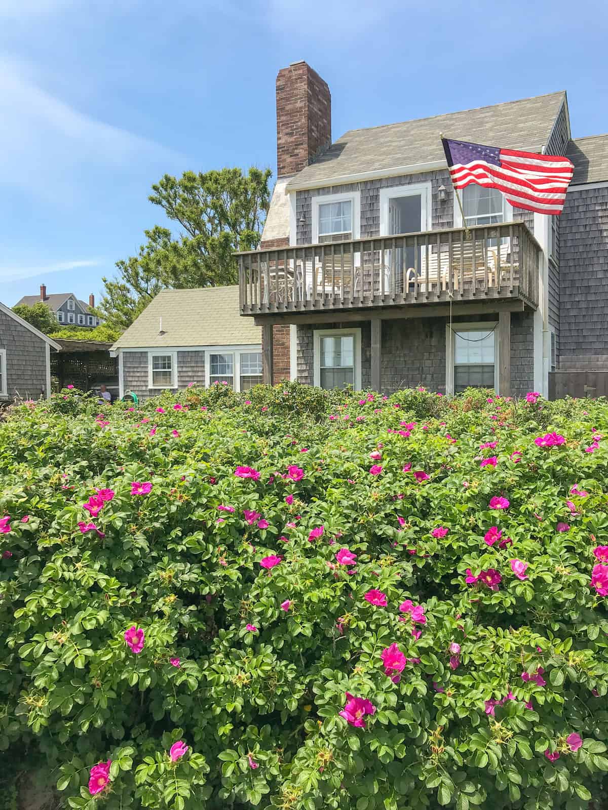 roses on the side of a shingled beach house